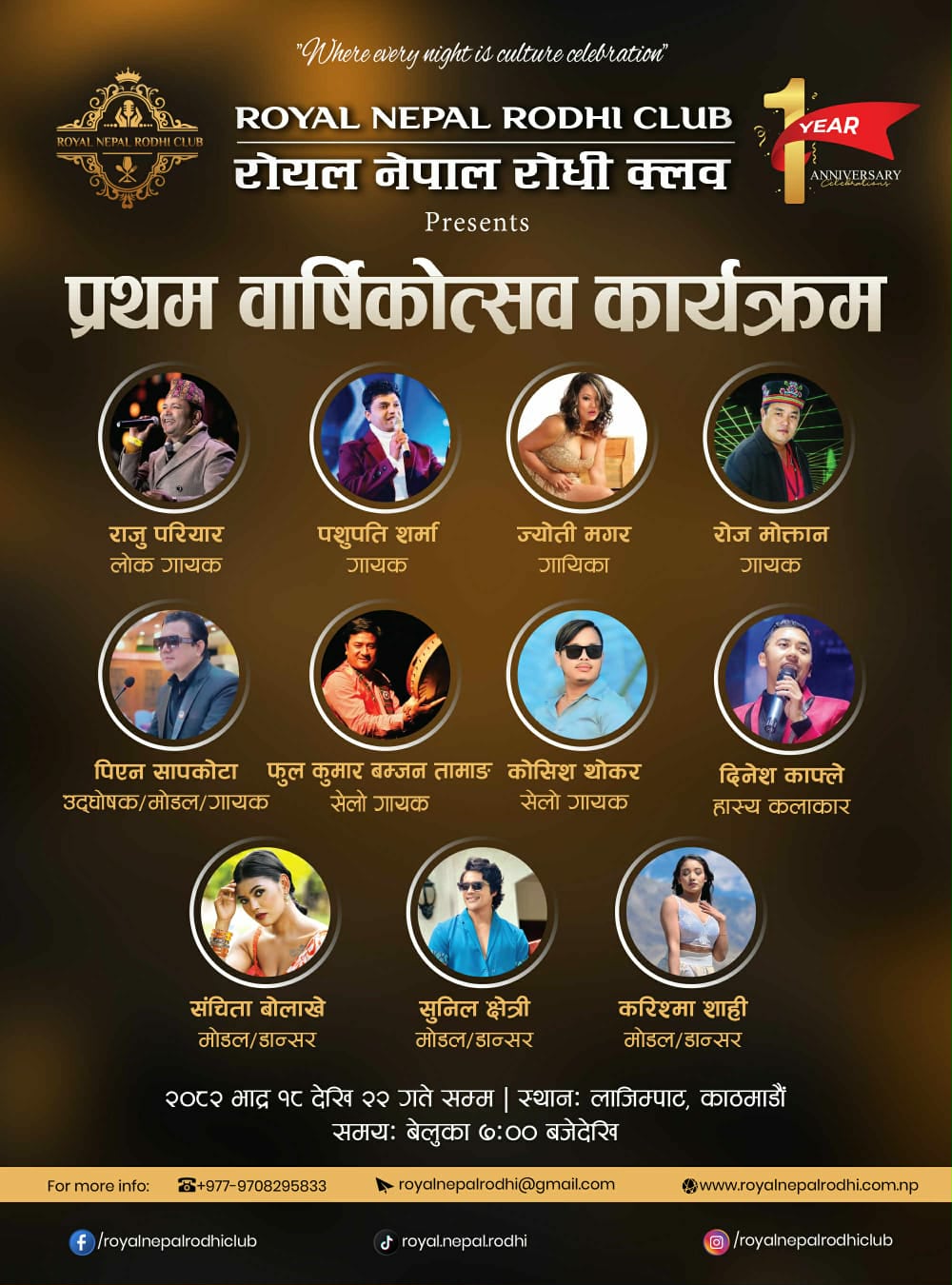 गत एक वर्षको उपलब्धि र अनुभवलाई स्मरण गर्दै, रोयल नेपाल रोधी क्लबले यस वार्षिकोत्सवलाई नेपाली कला, संस्कृति र आधुनिक आतिथ्यको विलासी संगमका रूपमा प्रस्तुत गर्ने लक्ष्य लिएको छ। क्लबले आगामी दिनमा अझ गुणस्तरीय सेवा, स्वादिष्ट र स्वास्थ्यप्रद भोजन, प्रीमियम पेय पदार्थ तथा आकर्षक सांगीतिक/सांस्कृतिक प्रस्तुतिमार्फत पाहुनालाई उत्कृष्ट अनुभव प्रदान गर्ने प्रतिबद्धता जनाएको छ।