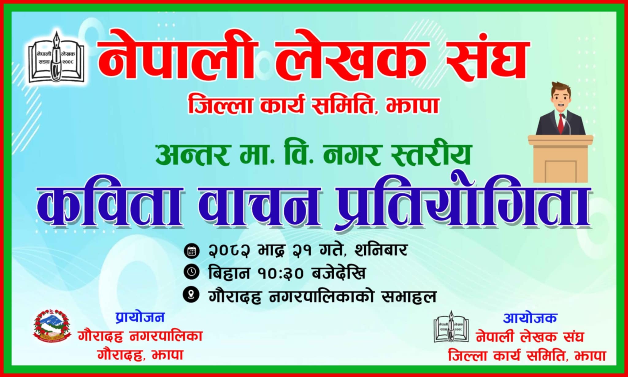 झापा – नेपाली लेखक संघ जिल्ला कार्य समिति, झापाको आयोजनामा गौरादहमा अन्तर माध्यमिक विद्यालय नगर स्तरीय कविता वाचन प्रतियोगिता हुने भएको छ ।